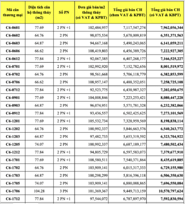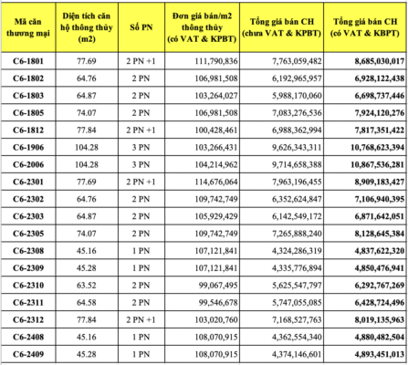 · 1 PN (45 m2): từ 4.5 · 2 PN (62-65 m2): từ 7-8 tỷ · 2 PN+ (77 m2): 8-10 tỷ · 3 PN (104 m2): 11-12 tỷ |