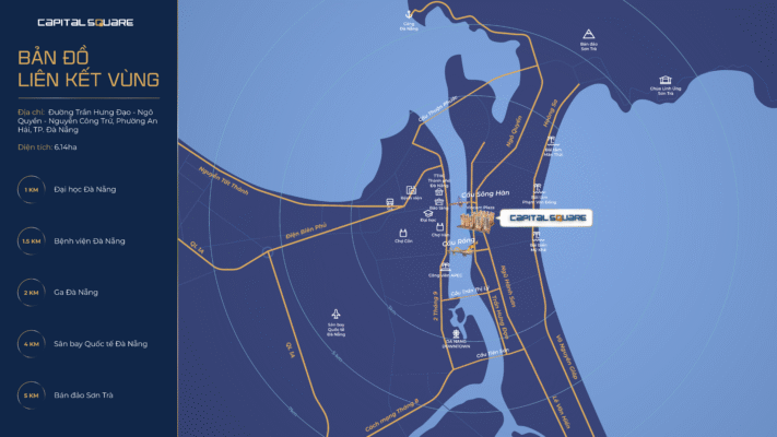 Capital Square sở hữu vị trí kim cương ngay trung tâm của TP. Đà Nẵng, ngay bên cạnh cây Cầu Sông Hàn biểu tượng của thành phố, với một vị trí hiếm có khó tìm với 4 mặt đắc địa: