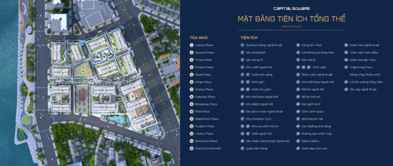 Mặt bằng dự án Capital Square tại Đà Nẵng bao gồm hai phân khu chính: Capital Square 2 (gồm 1.681 căn hộ, trong đó có 502 căn dành cho người nước ngoài) và Capital Square 3 (gồm 1.710 căn hộ, với 512 căn dành cho người nước ngoài), với tổng cộng 14 tòa tháp cao từ 24 đến 29 tầng, được xây dựng trên diện tích 61.368 m². Dự án có mật độ xây dựng thấp (40%) nhằm tạo không gian sống thoáng đãng,chan hòa với thiên nhiên và tích hợp các tiện ích hiện đại tại khối đế.
