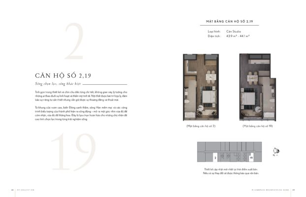 | Sản phẩm | · Studio: 06 căn (02; 09; 10; 12; 15; 19) – Diện tích: 43,1 – 44,2 m2