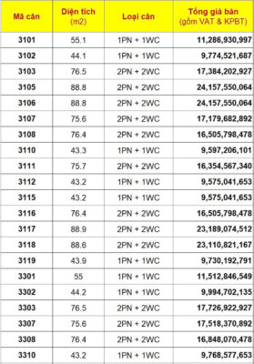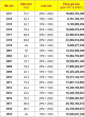 · 1 PN: 01 căn (01) – Diện tích: 55,1 m2 · 2 PN: 05 căn (03; 07; 08; 11; 16) – Diện tích: 75,6 – 76,4 m2 · 2 PN góc: 04 căn (05; 06; 17; 18) – Diện tích: 88,8 m2 |