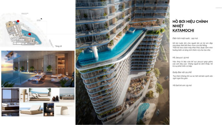 · Tầng 1-6: Khối đế với các tiện ích · Tầng 7-17: 186 phòng khách sạn cao cấp · Tầng 18: Hồ bơi Katamochi nước ấm, Sky Gym · Tầng 19-41: 264 căn hộ cao cấp mang thương hiệu NOBU Residences · Tầng 42: Nhà hàng NOBU · Tầng 43: Tsukimidai Sky Bar |
