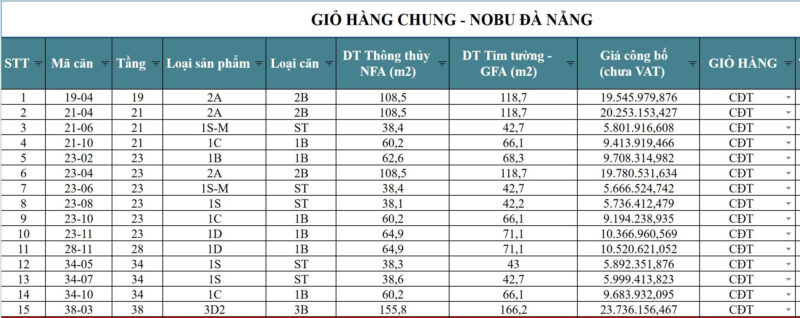 | Tên thương mại | NOBU RESIDENCES DA NANG | |||||||||||||||||||||||||||||||
