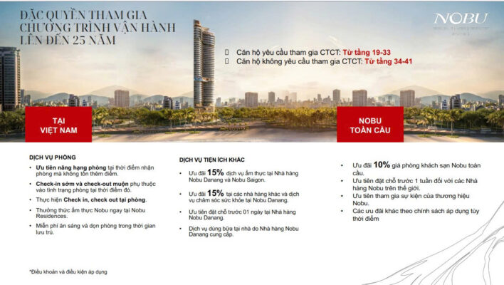 | Sản phẩm | 264 căn hộ thương hiệu NOBU từ tầng 19-41 (tầng 23-33 bắt buộc tham gia chương trình cho thuê) | |||||||||||||||||||||||||||||||