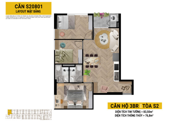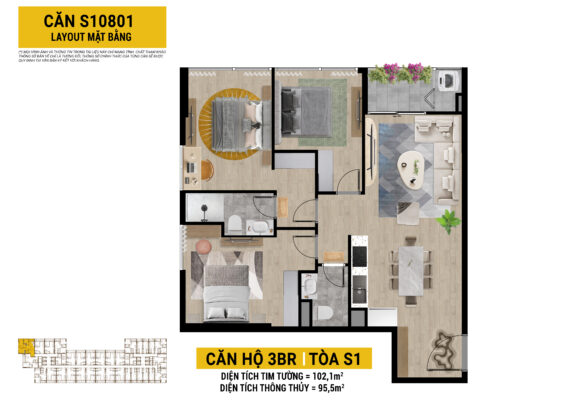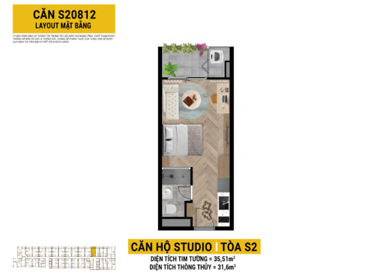 Tầng 3–21: Căn hộ cao cấp (Studio, 1BR+, 2BR, 3BR) với trần cao 3,5m, hành lang rộng 1,8m